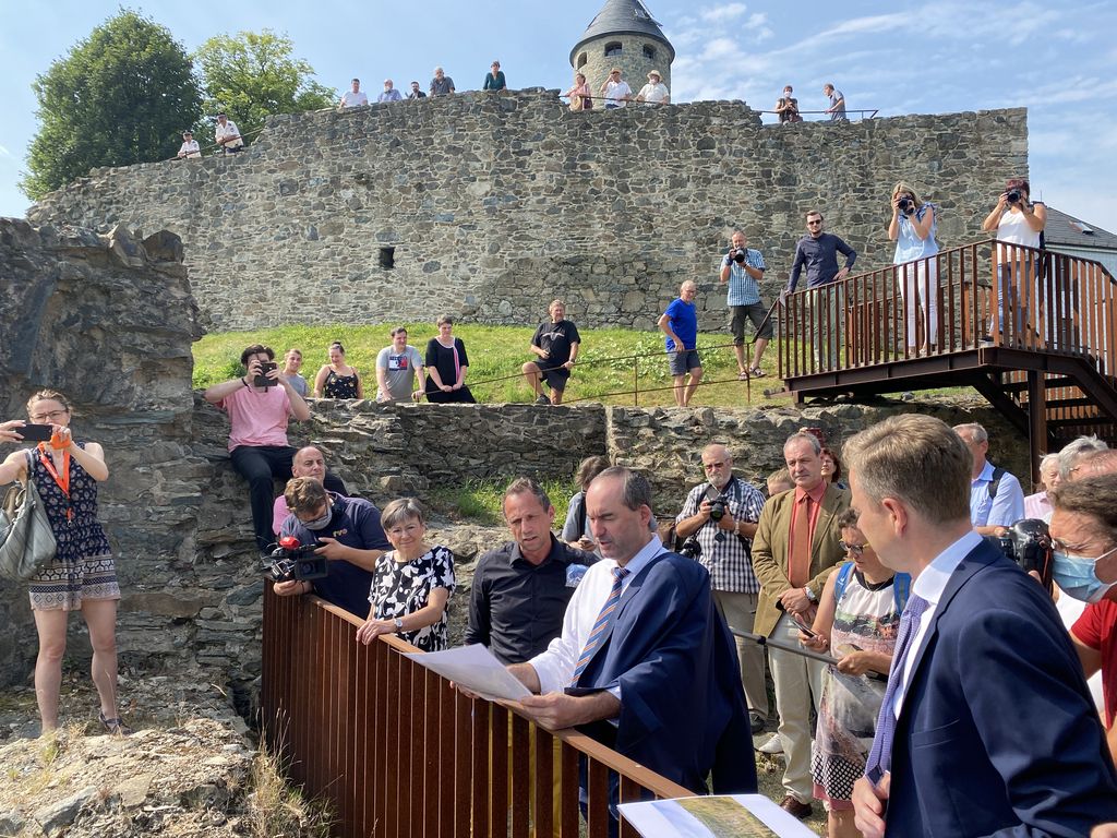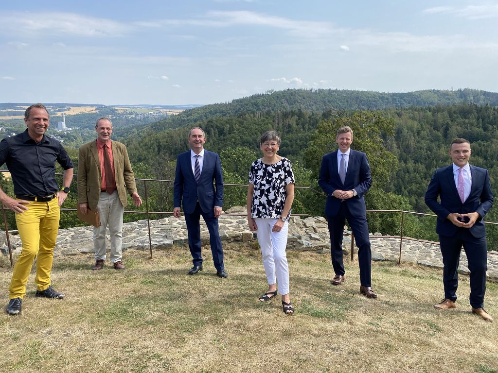 v.l.n.r.: Umweltminister Thorsten Glauber, Matthias Quehl (Stadt Lichtenberg), Wirtschaftsminister Hubert Aiwanger, Heidrun Piwernetz (Präsidentin Regierung Oberfranken), Landrat Oliver Bär. © StMWi Bild herunterladen 5 MB