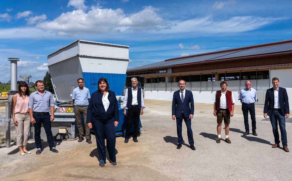 v.l.n.r.: Ehepaar Poschner; Franz Winkler, Fachverband Biogas; Kerstin Ikenmeyer, Bayerisches Wirtschaftsministerium; Hermann Greif, Bayerischer Bauernverband; Wirtschaftsminister Hubert Aiwanger; Martin Poschner, Bürgermeister Gemeinde Halsbach; Anton Föggl, Bauernbund; Dr. Stefan Rauh, Fachverband Biogas. © StMWi/E. Neureuther