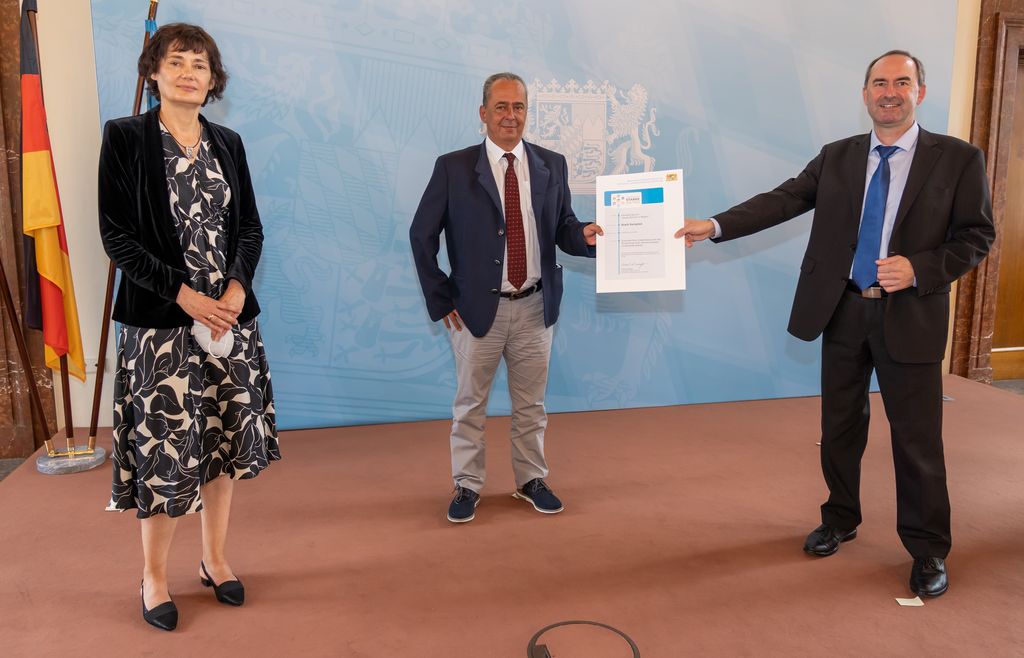 Von links: Tourismus- und Kulturamtsleiter von Beilngries Andreas Seyller, Bürgermeister von Beilngries Helmut Schloderer und Wirtschaftsminister Hubert Aiwanger bei der Übergabe der Teilnahmebescheinigung für das Fitnessprogramm „Starke Zentren“ © Elke Neureuther/StMWi Bild herunterladen 11 MB