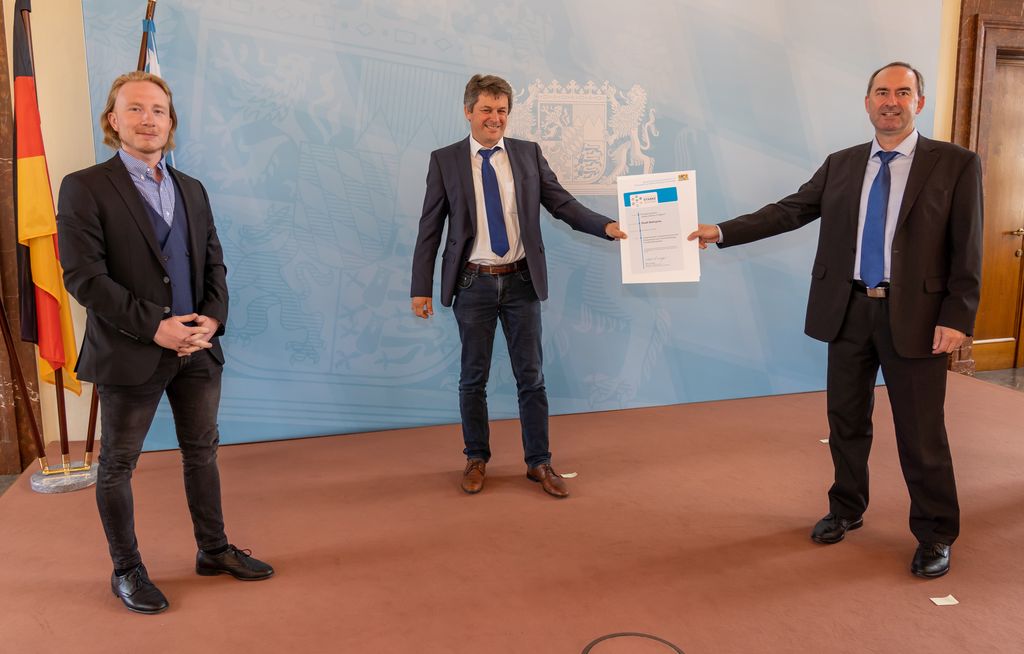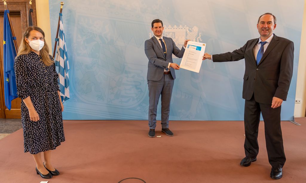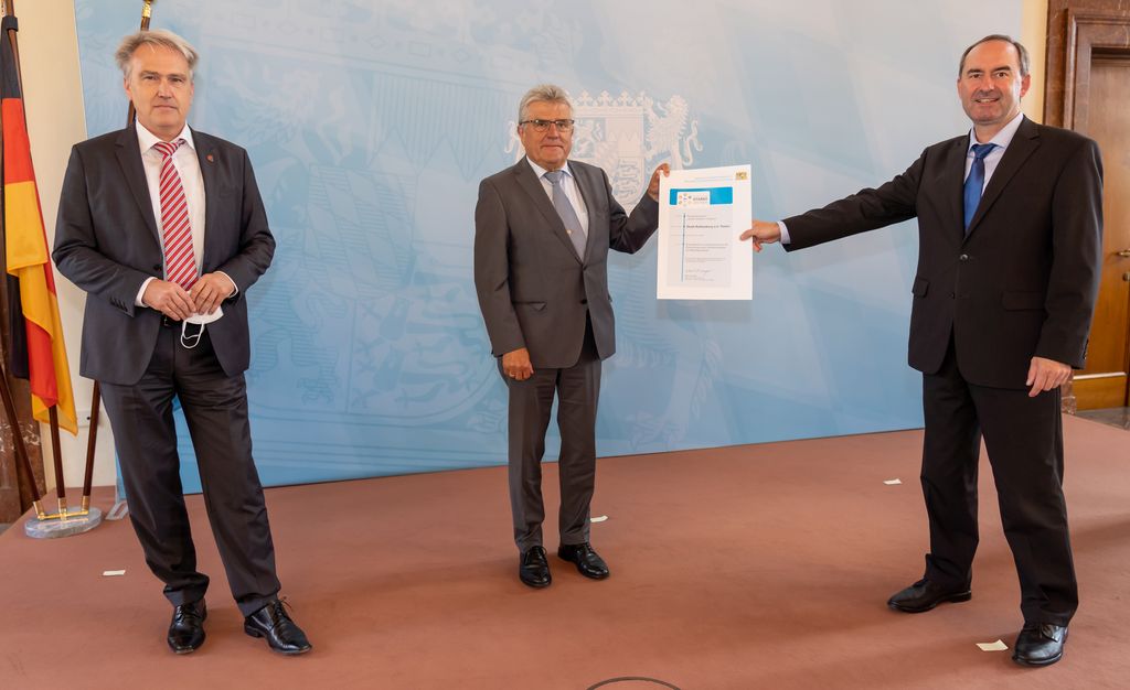 Von links: Andrea Süß vom Bauamt der Stadt Schwandorf, Oberbürgermeister von Schwandorf Andreas Feller und Wirtschaftsminister Hubert Aiwanger bei der Übergabe der Teilnahmebescheinigung für das Fitnessprogramm „Starke Zentren“ © Elke Neureuther/StMWi Bild herunterladen 10 MB