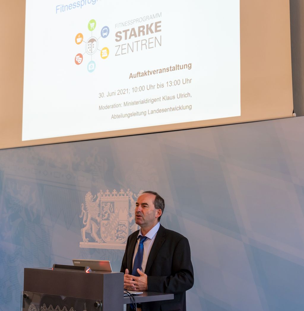 Bayerns Wirtschaftsminister Hubert Aiwanger spricht bei der Auftaktveranstaltung für das Fitnessprogramm „Starke Zentren“ © Elke Neureuther/StMWi Bild herunterladen 5 MB