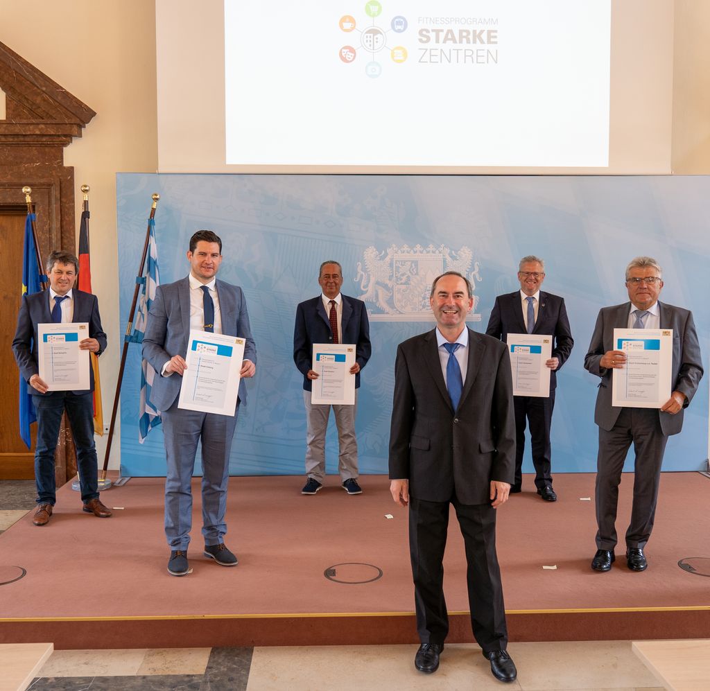 Die Teilnahmebescheinigungen für die fünf bayerischen Modellkommunen des Fitnessprogramms „Starke Zentren“ © Elke Neureuther/StMWi Bild herunterladen 10 MB