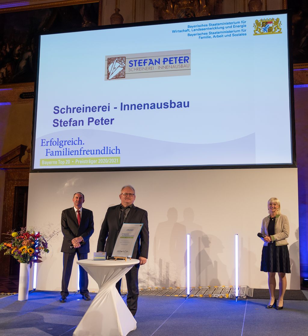 Die Schreinerei Stefan Peter aus Viechtach erhält die Auszeichnung "Erfolgreich.Familienfreundlich". © StMWi/E.Neureuther Bild herunterladen 2 MB