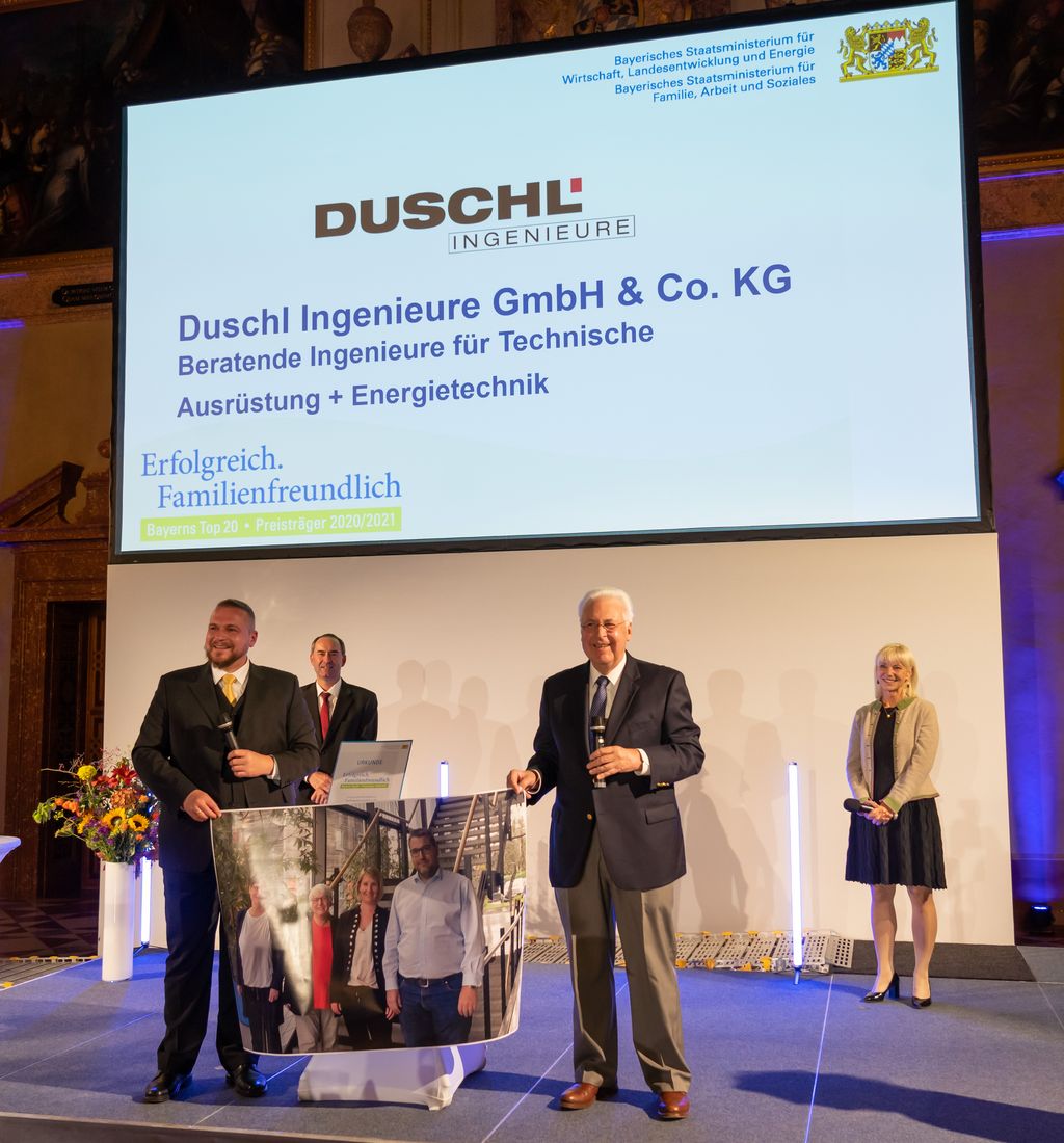 Die Duschl Ingenieure GmbH & Co. KG aus Rosenheim erhält die Auszeichnung "Erfolgreich.Familienfreundlich". © StMWi/E.Neureuther Bild herunterladen 3 MB
