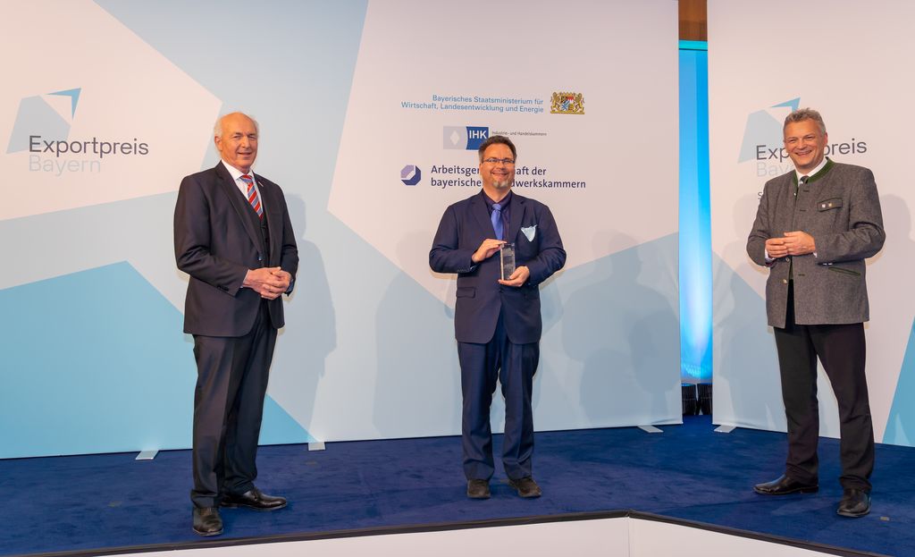Bayerns Wirtschaftsstaatssekretär Roland Weigert überreicht die Exportpreise 2021 an drei Unternehmen. Weigert: "Exportpreis-Gewinner sind Botschafter für das Qualitätssiegel "Made in Bavaria".