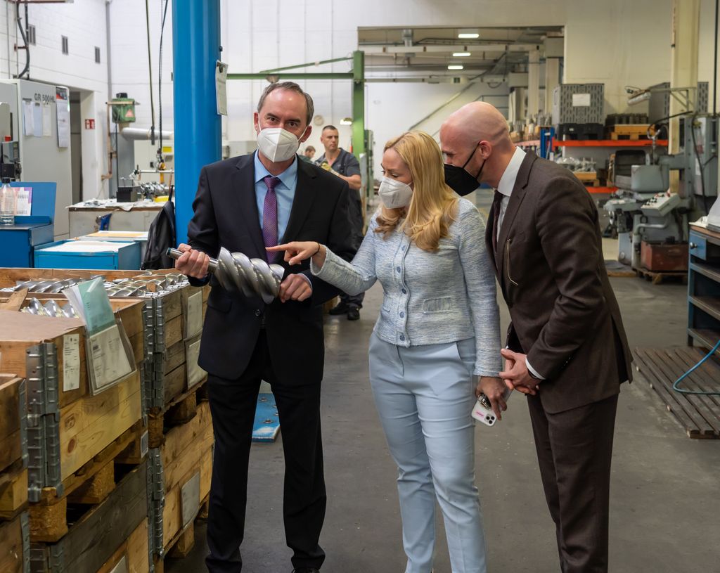 Geschäftsführerin Julia Jäcklin zeigt bei einem Rundgang Bayerns Wirtschaftsminister Hubert Aiwanger und MdL Dr. Fabian Mehring die FFP2-Maskenproduktion. Bild herunterladen 8 MB