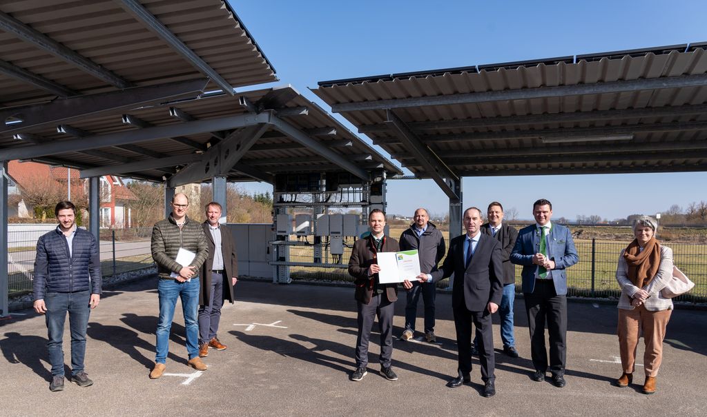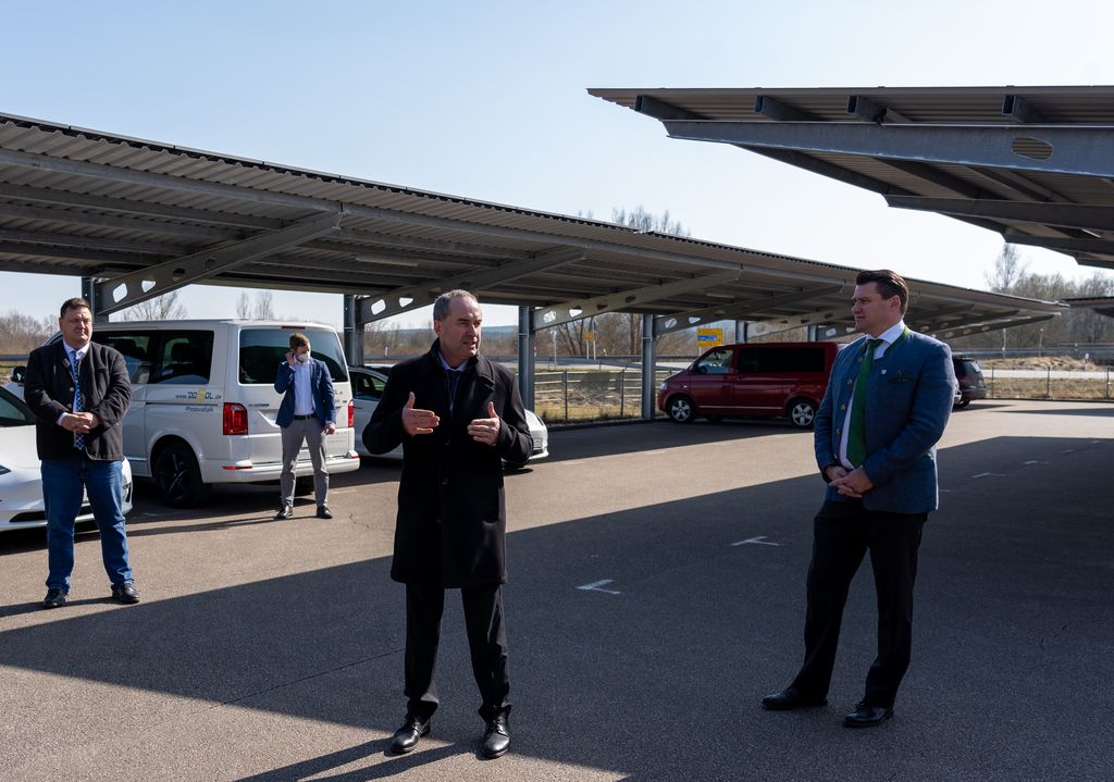Bayerns Wirtschaftsminister Hubert Aiwanger besichtigt ein Solar-Carport in der Gemeinde Fensterbach. Solar-Carportsysteme verbinden Stellplatzüberdachung und Energiegewinnung und tragen zur sauberen Energiegewinnung bei.