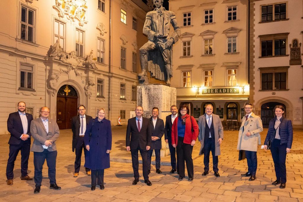 Bayerns Wirtschaftsminister Hubert Aiwanger (3.v.l.) mit Delegationsteilnehmern vor der Spanischen Hofreitschule in Wien. © StMWi/E.Neureuther Bild herunterladen 10 MB