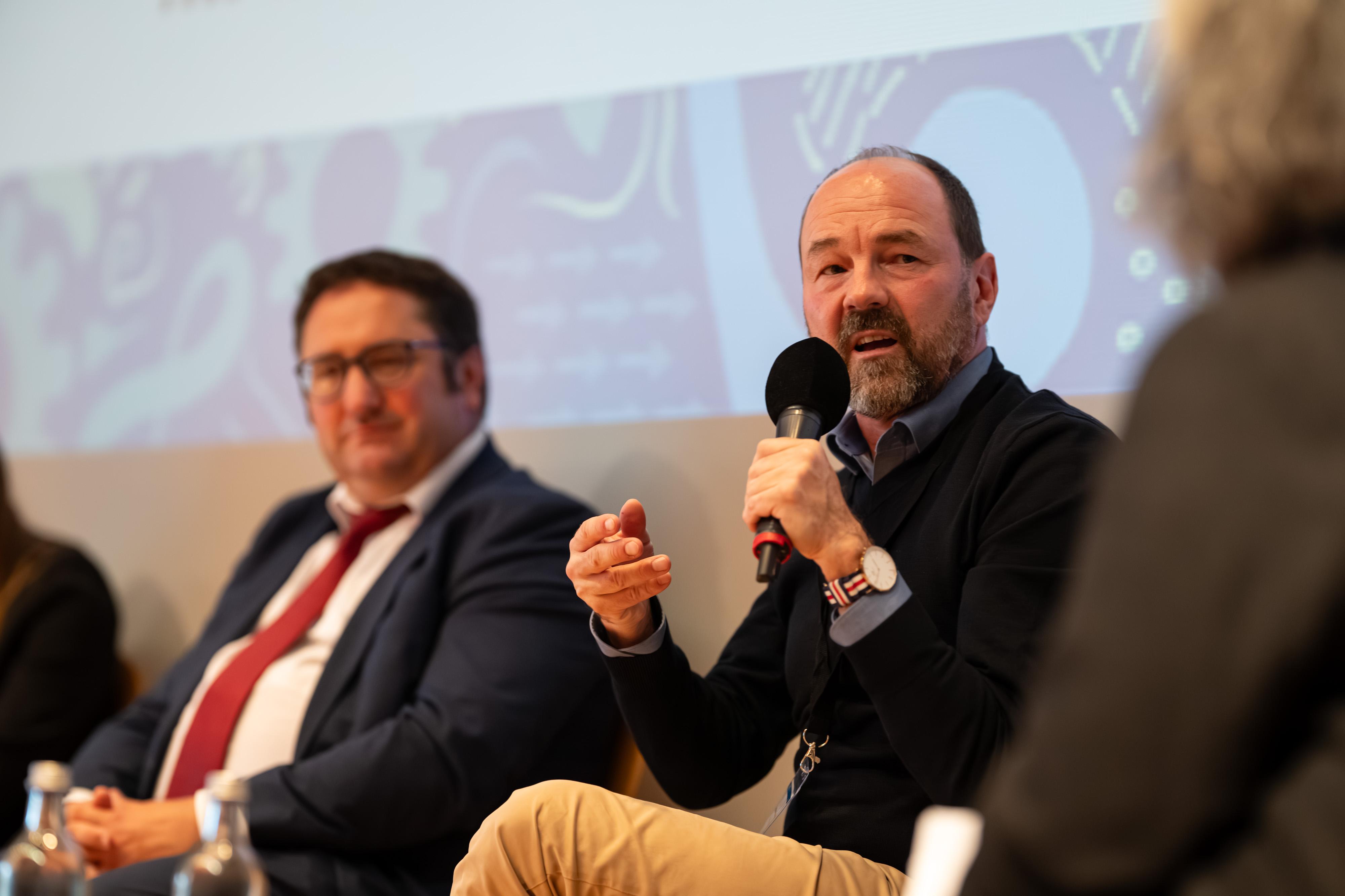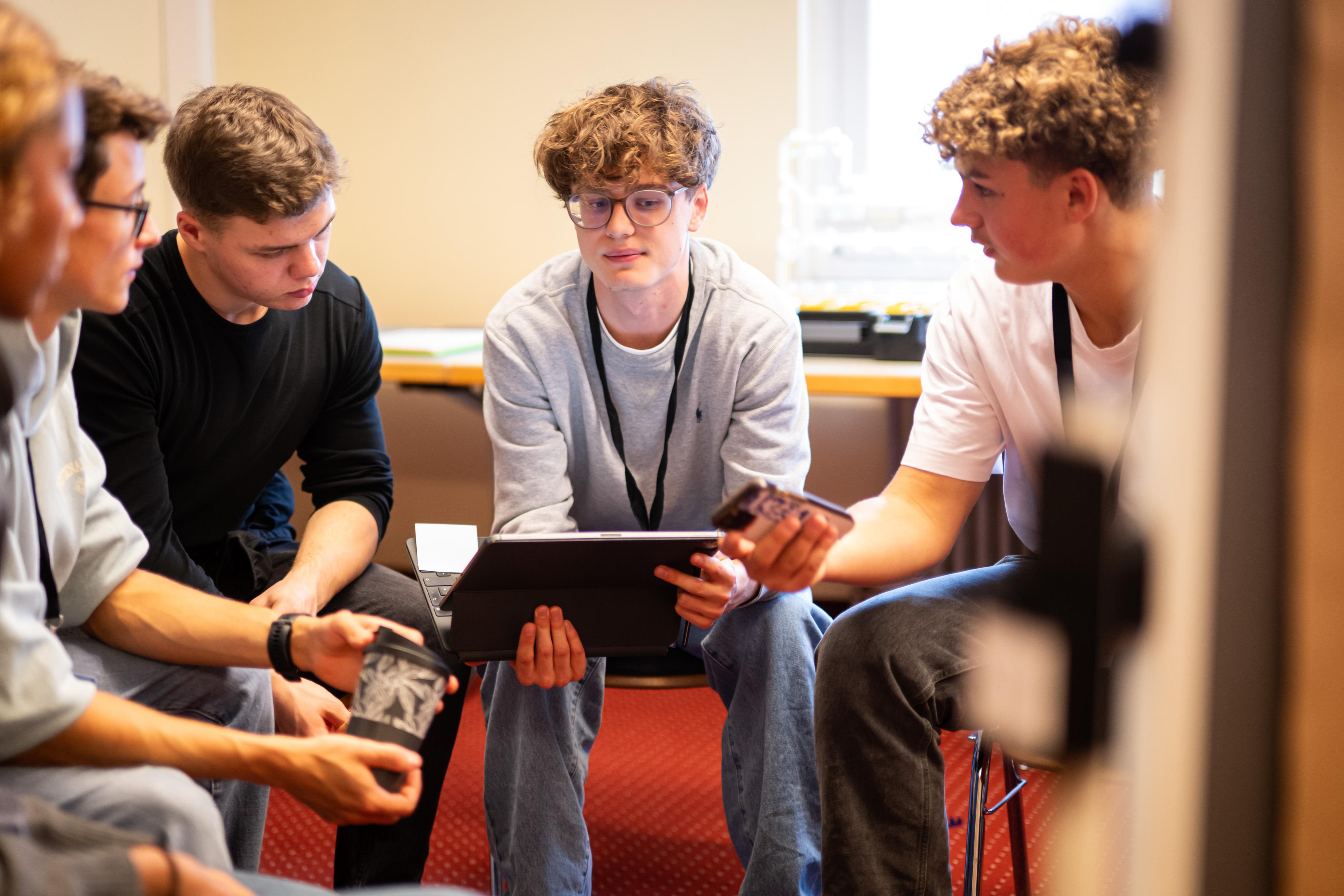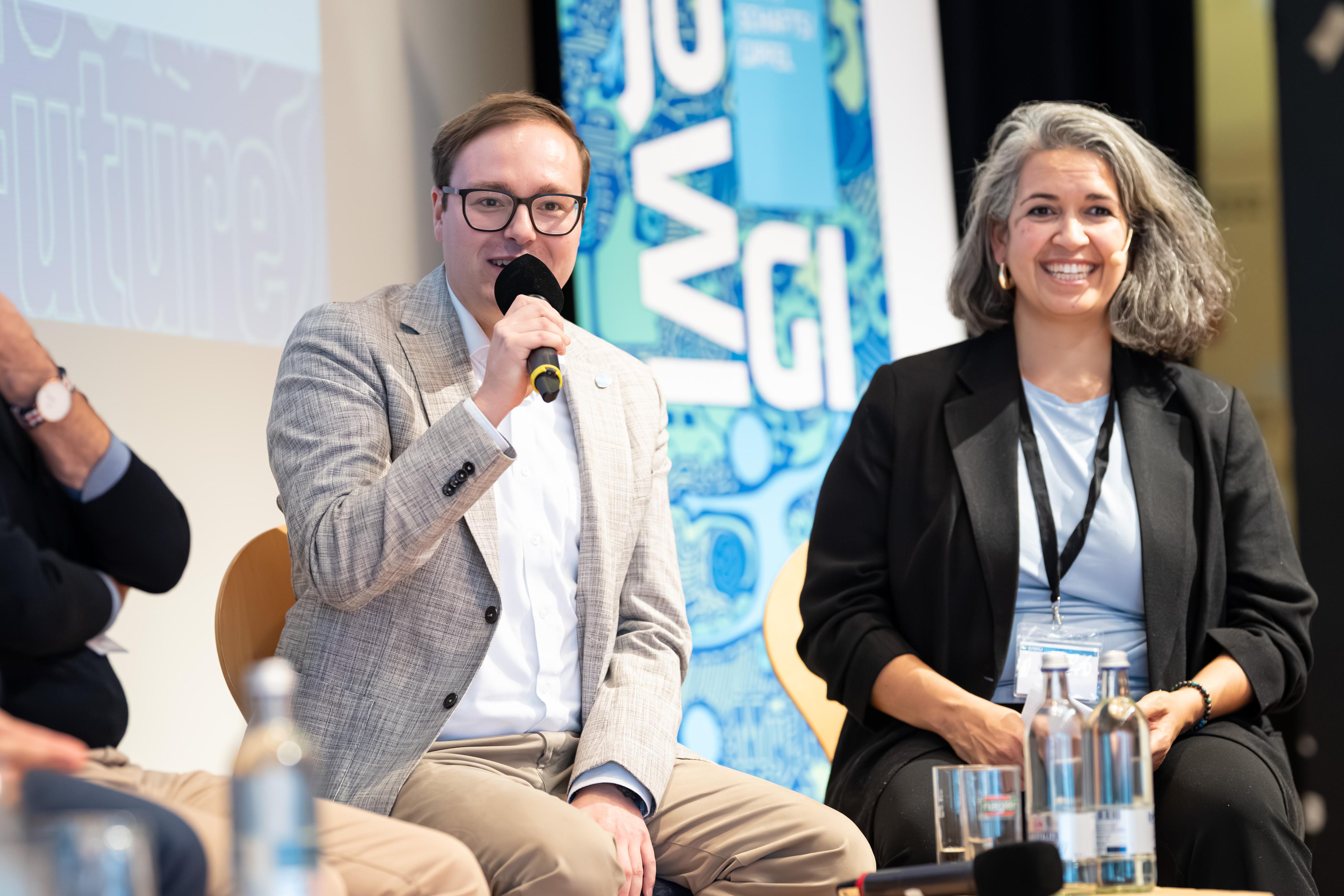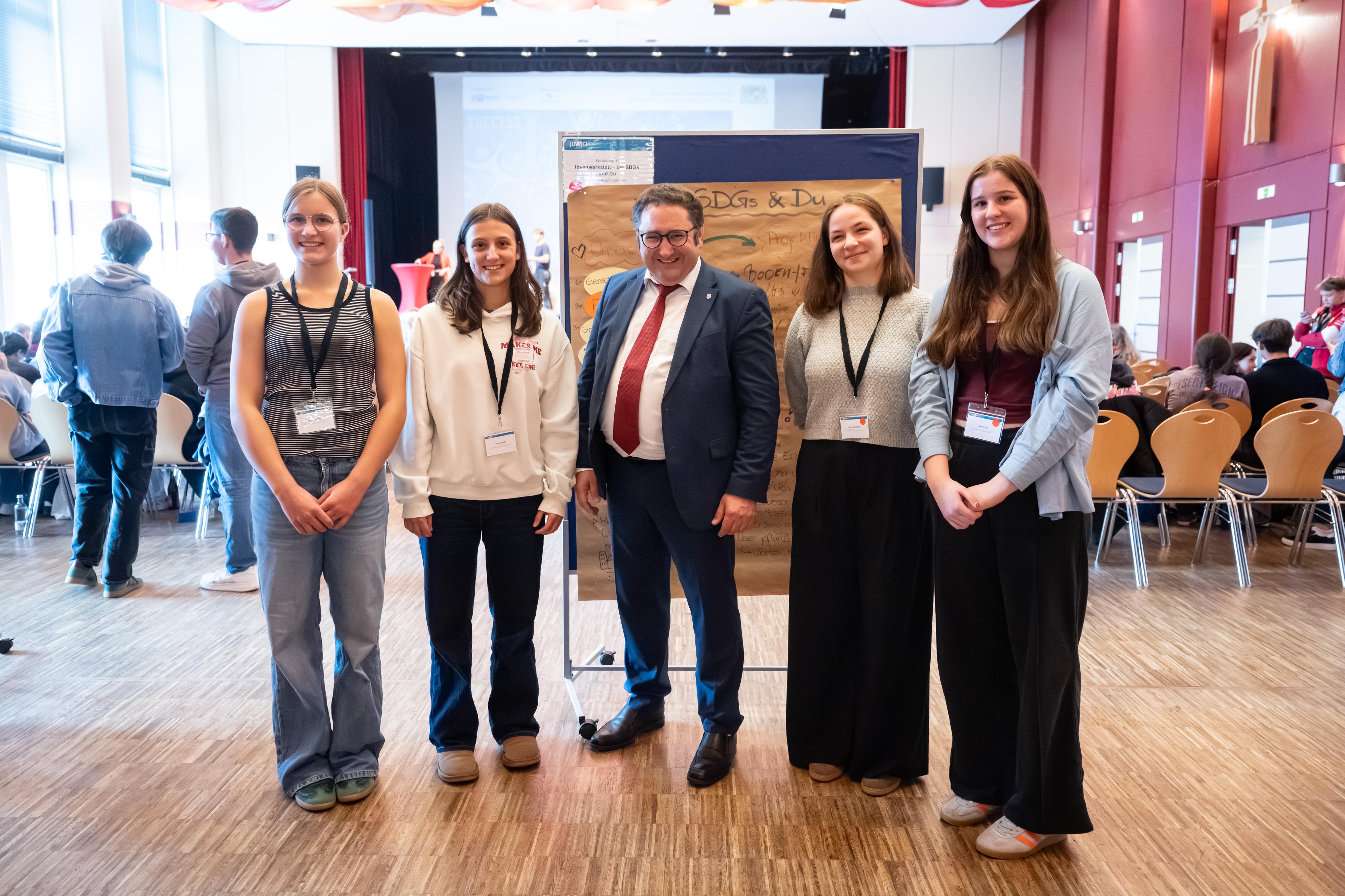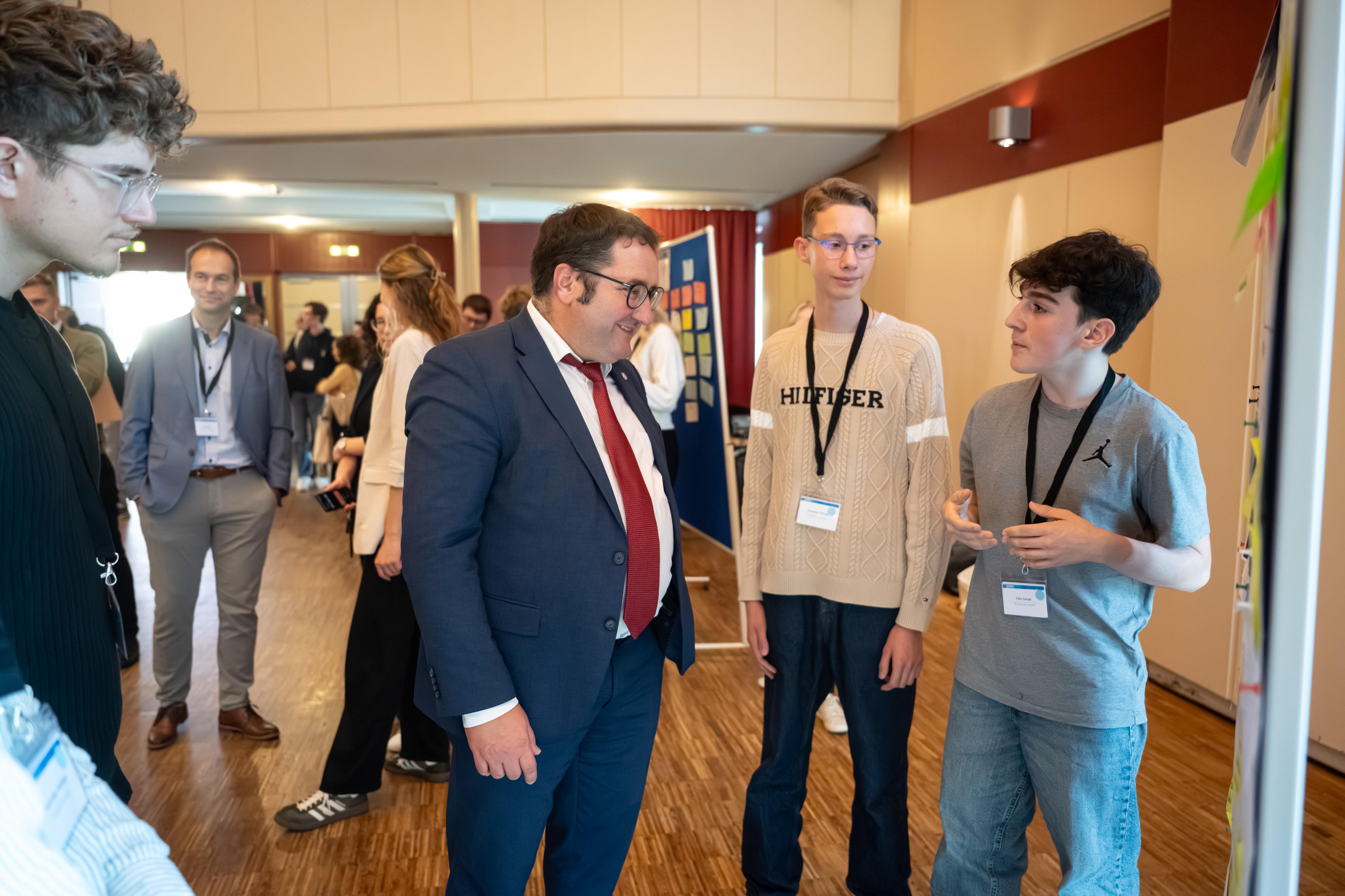 Bayerns Wirtschaftsstaatssekretär Tobias Gotthardt tauscht sich beim Jugendwirtschaftsgipfel 2025 mit den Jugendlichen aus.