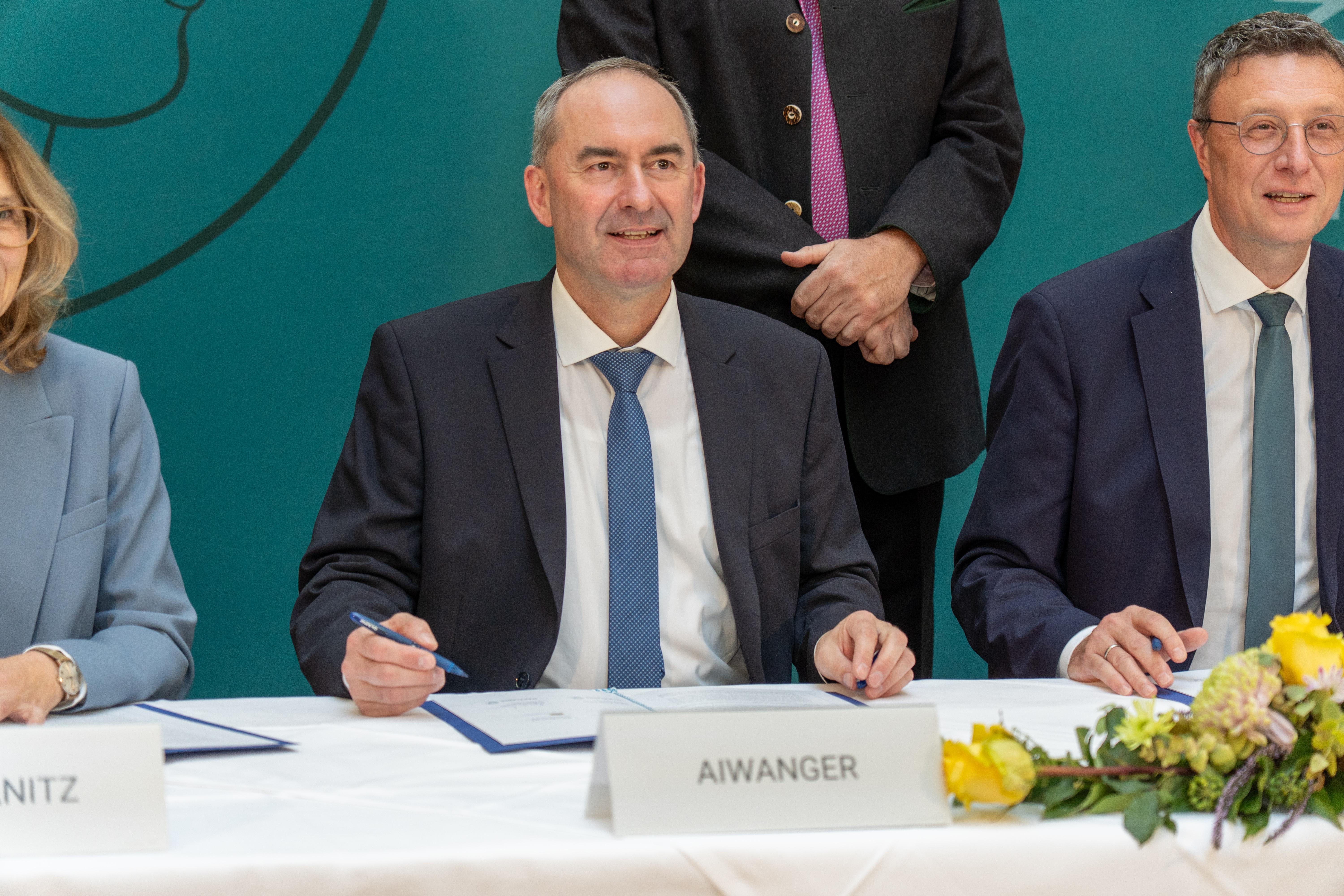 Bayerns Wirtschaftsminister Hubert Aiwanger bei der Unterzeichnung der Absichtserklärung zum neuen Institutsstandort der Max-Planck-Gesellschaft in Würzburg Bild herunterladen 3 MB