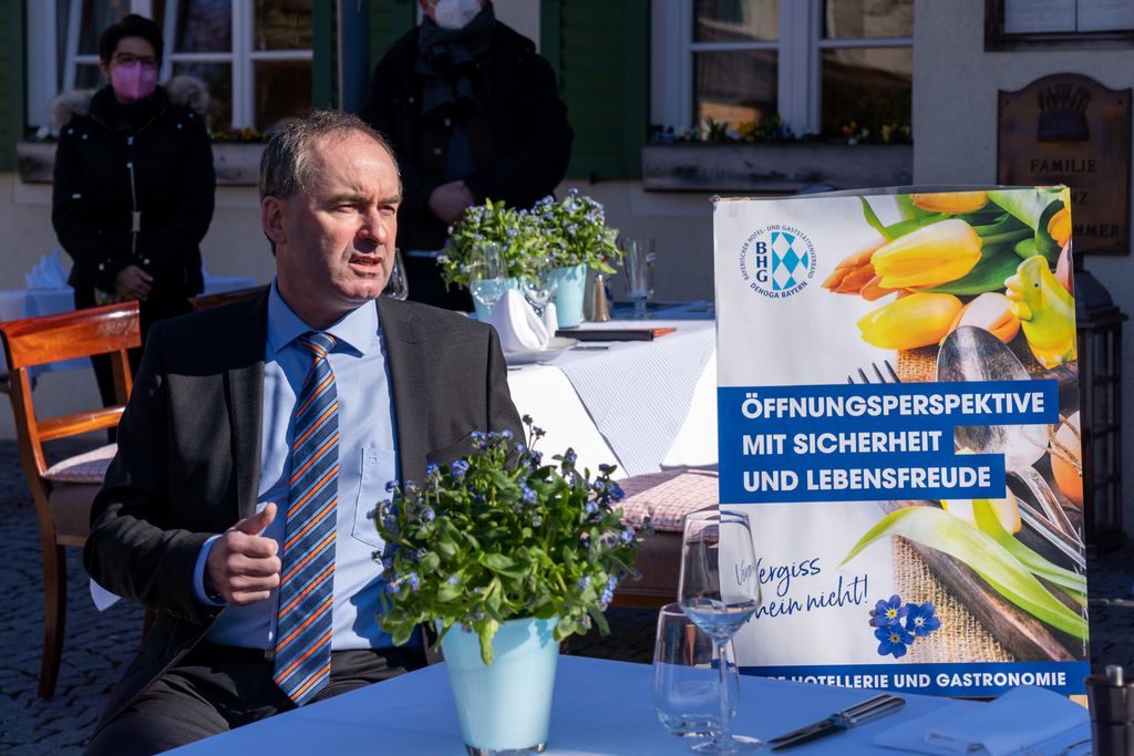 Bayerns Wirtschaftsminister Hubert Aiwanger informiert sich über die Forderungen von Gastronomie und Hotellerie. © StMWi/E.Neureuther Bild herunterladen 11 MB