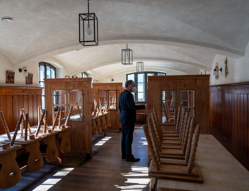 Bayerns Wirtschaftsminister Hubert Aiwanger macht sich ein Bild vom leeren Gaststättenraum beim Besuch in Aying. © StMWi/E. Neureuther Bild herunterladen 9 MB