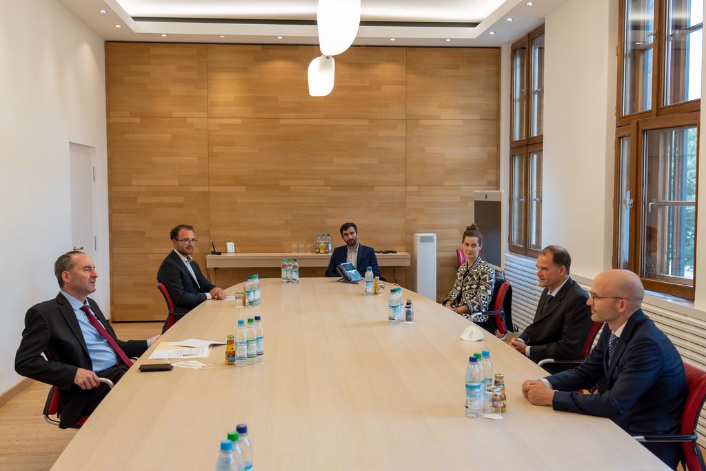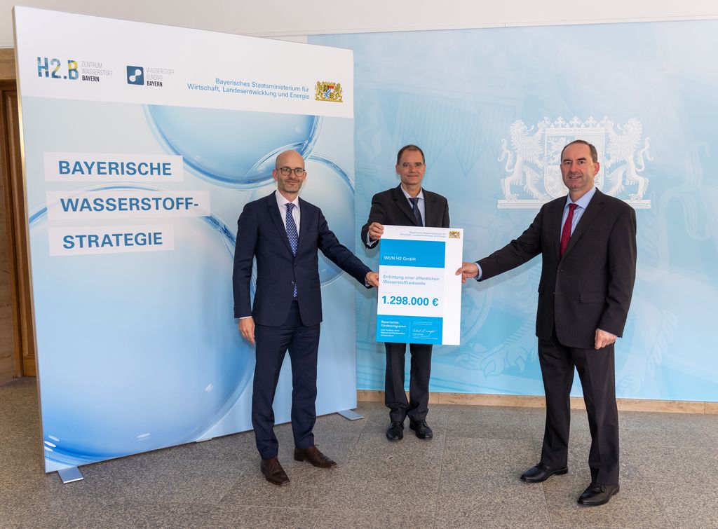 Bayerns Wirtschaftsminister Hubert Aiwanger übergibt den ersten Förderbescheid im Rahmen des Bayerischen Förderprogramms zum Aufbau einer Wasserstofftankstelleninfrastruktur an die WUN H2 GmbH.