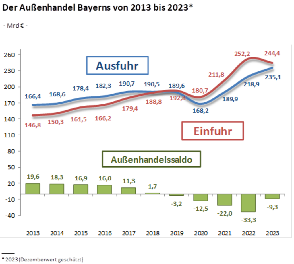 In absoluten Zahlen exportierte Bayerns Wirtschaft 2022 Güter im Wert von 218,9 Milliarden Euro. 2023 wurde mit 235,1 Milliarden Euro erneut ein Exportrekord erreicht. Die Importe lagen mit 252,2 Milliarden Euro (2022) und 244,4 Milliarden Euro im Jahr 2023 noch höher (siehe anhängende Grafik).